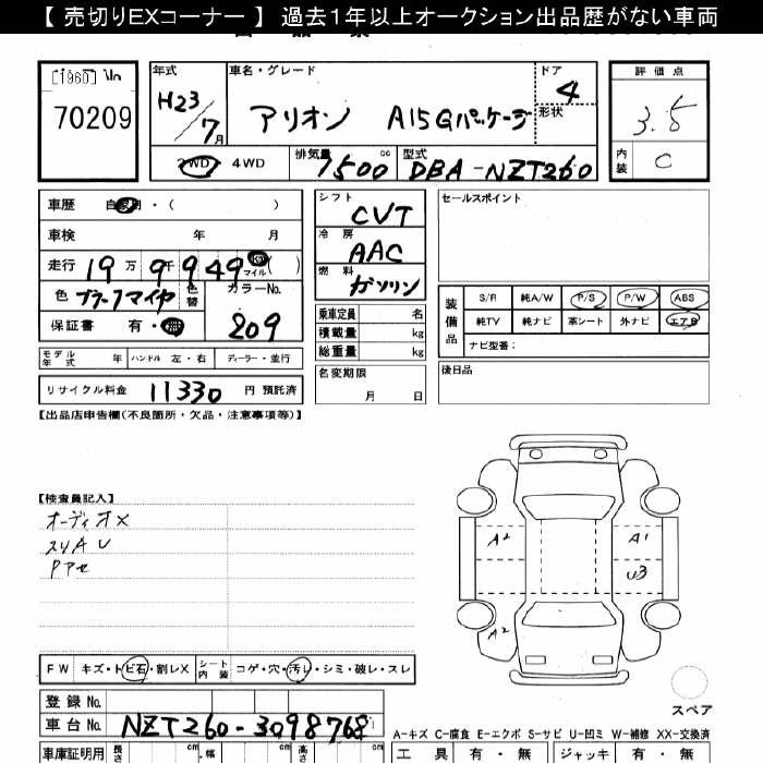 TOYOTA ALLION - лот 70209