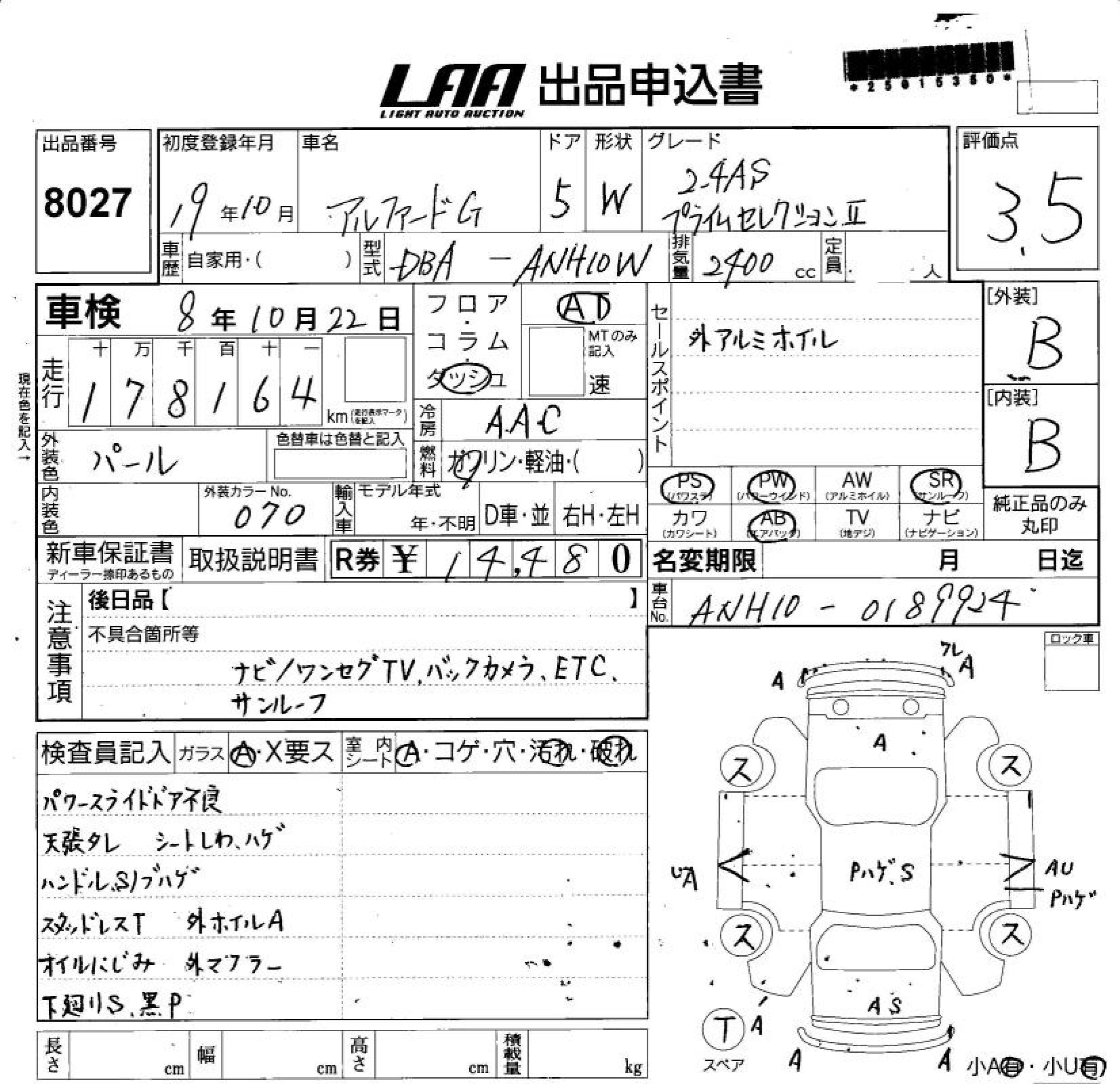 TOYOTA ALPHARD G 2.4AS PRIME SELECTION - лот 8027