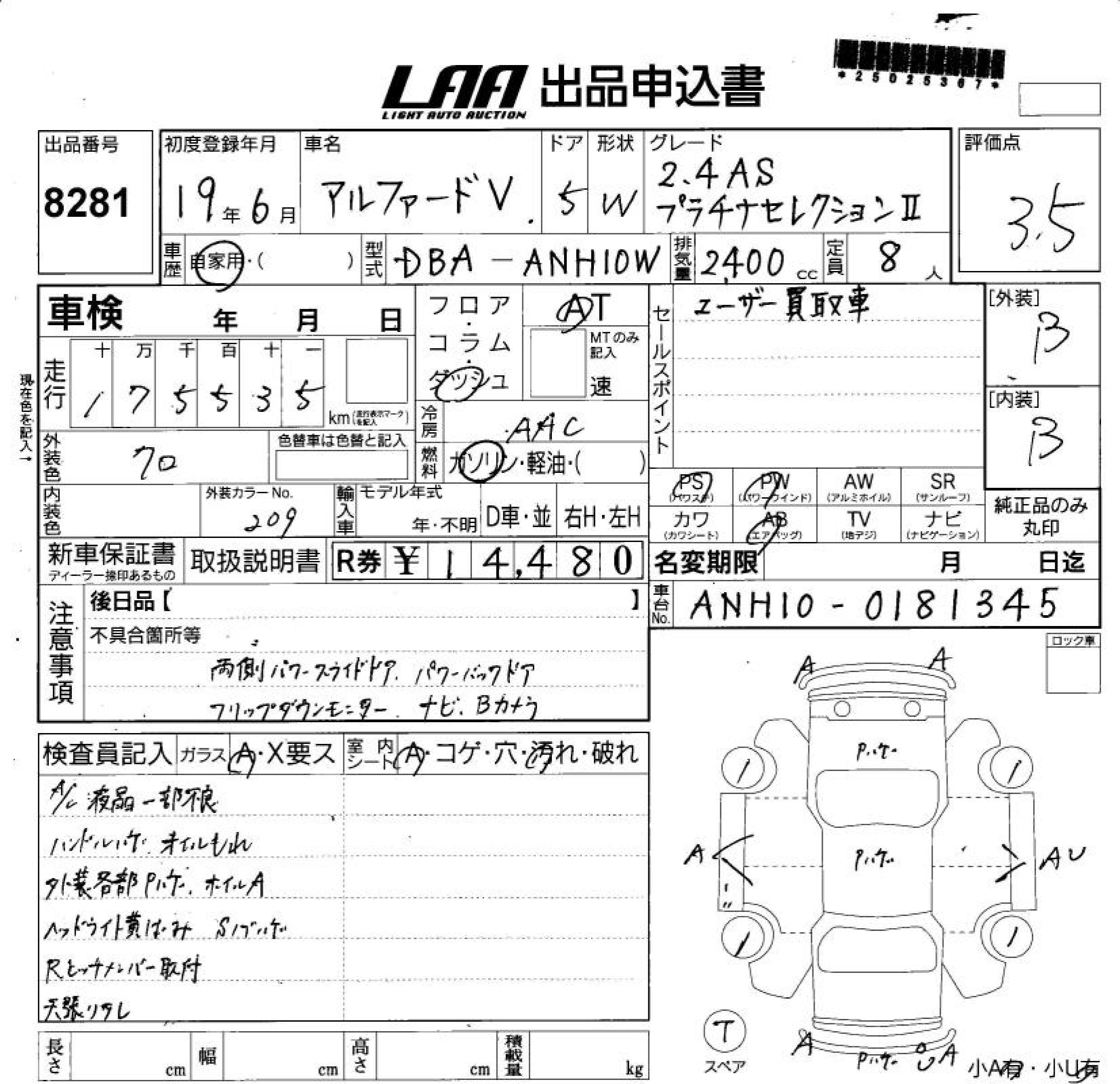 TOYOTA ALPHARD V 2.4AS PLATINUM SELECTION - лот 8281