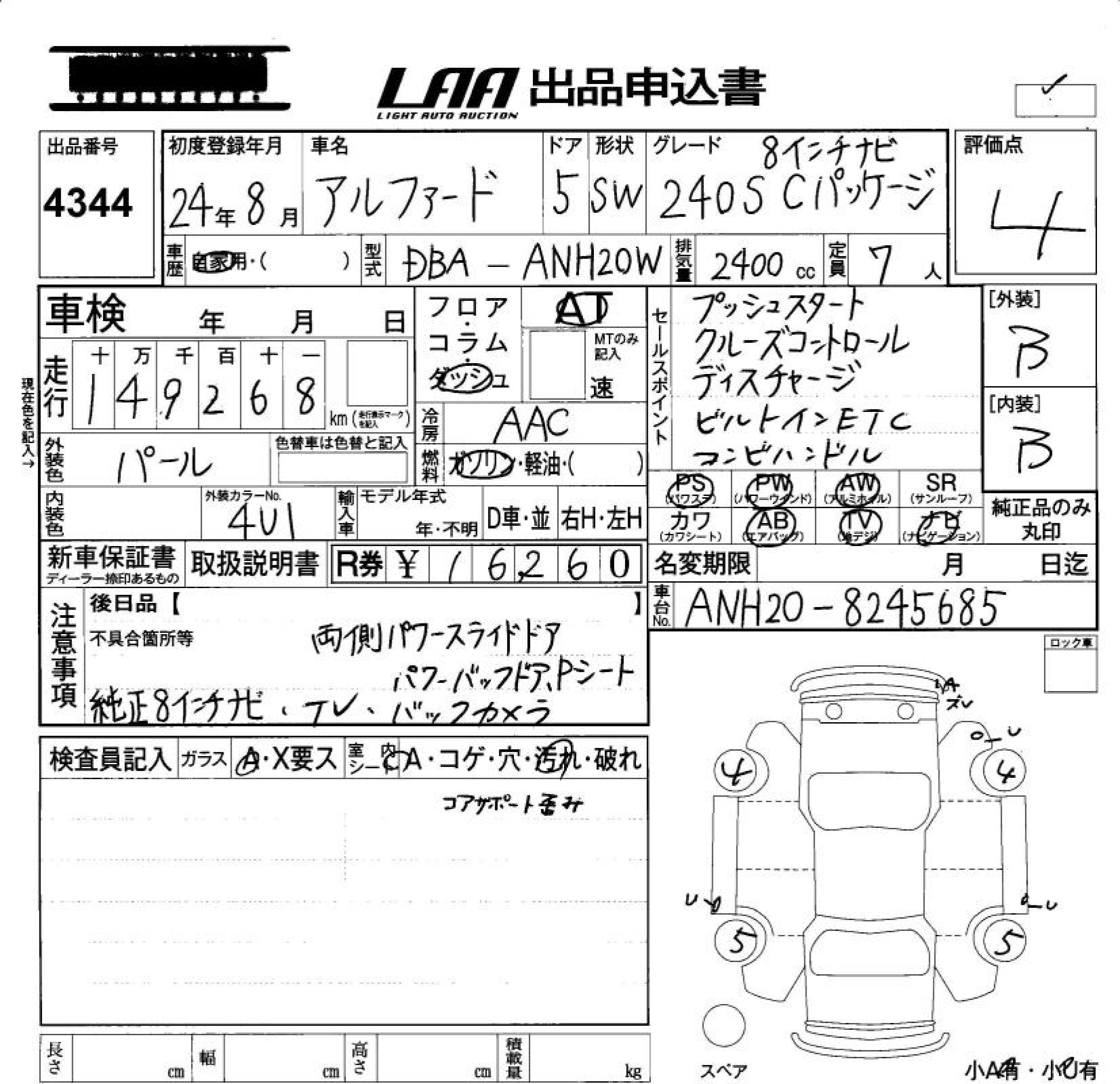 TOYOTA ALPHARD 240S C PACKAGE 8 IN - лот 4344