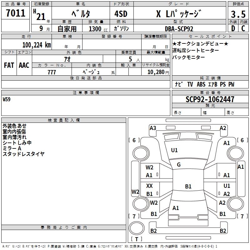 TOYOTA BELTA X L PACKAGE - лот 7011