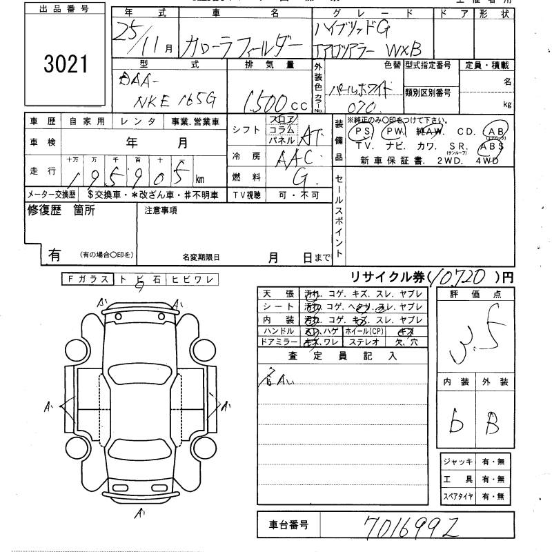 TOYOTA COROLLA FIELDER - лот 3021