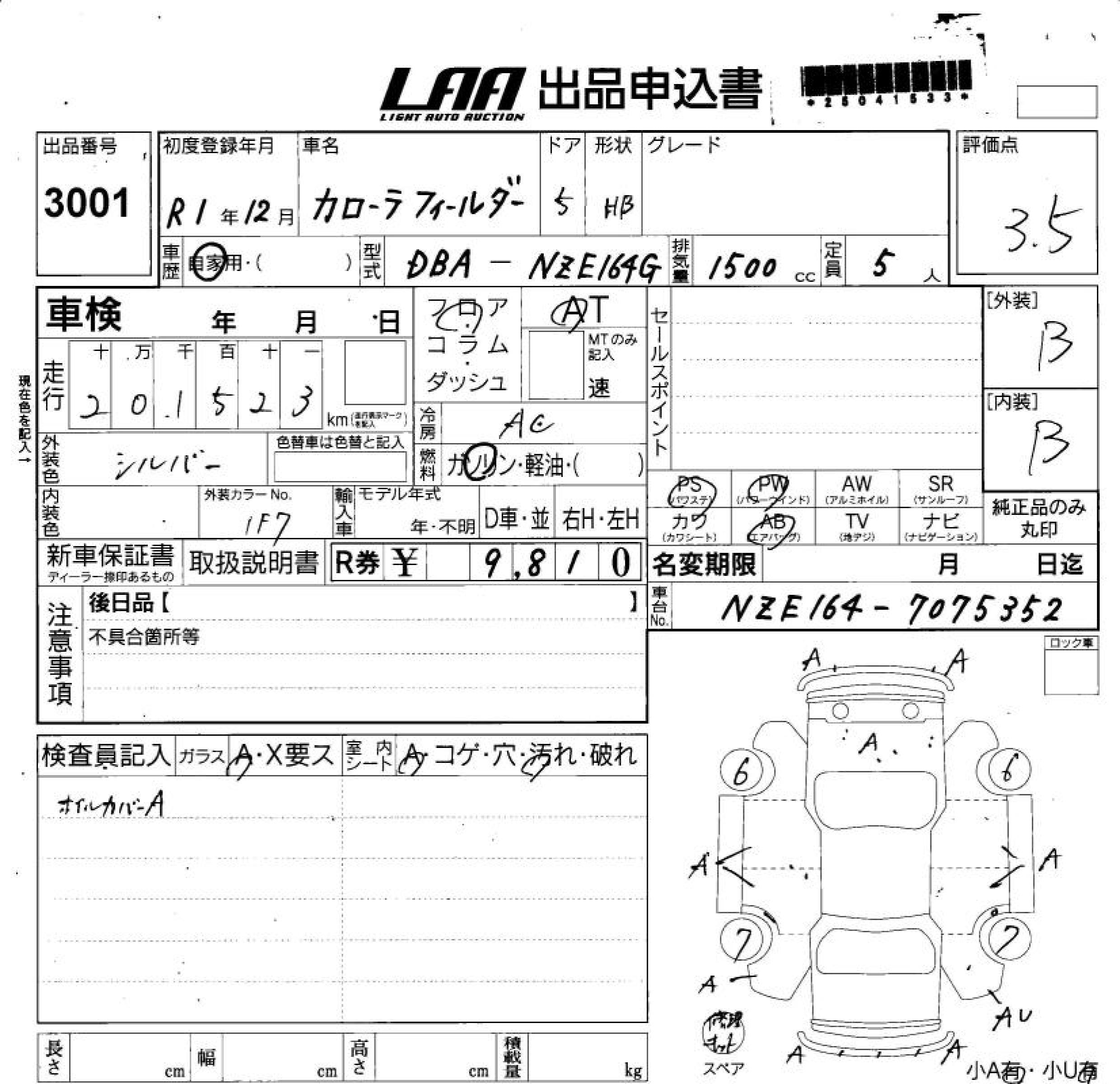 TOYOTA COROLLA FIELDER - лот 3001