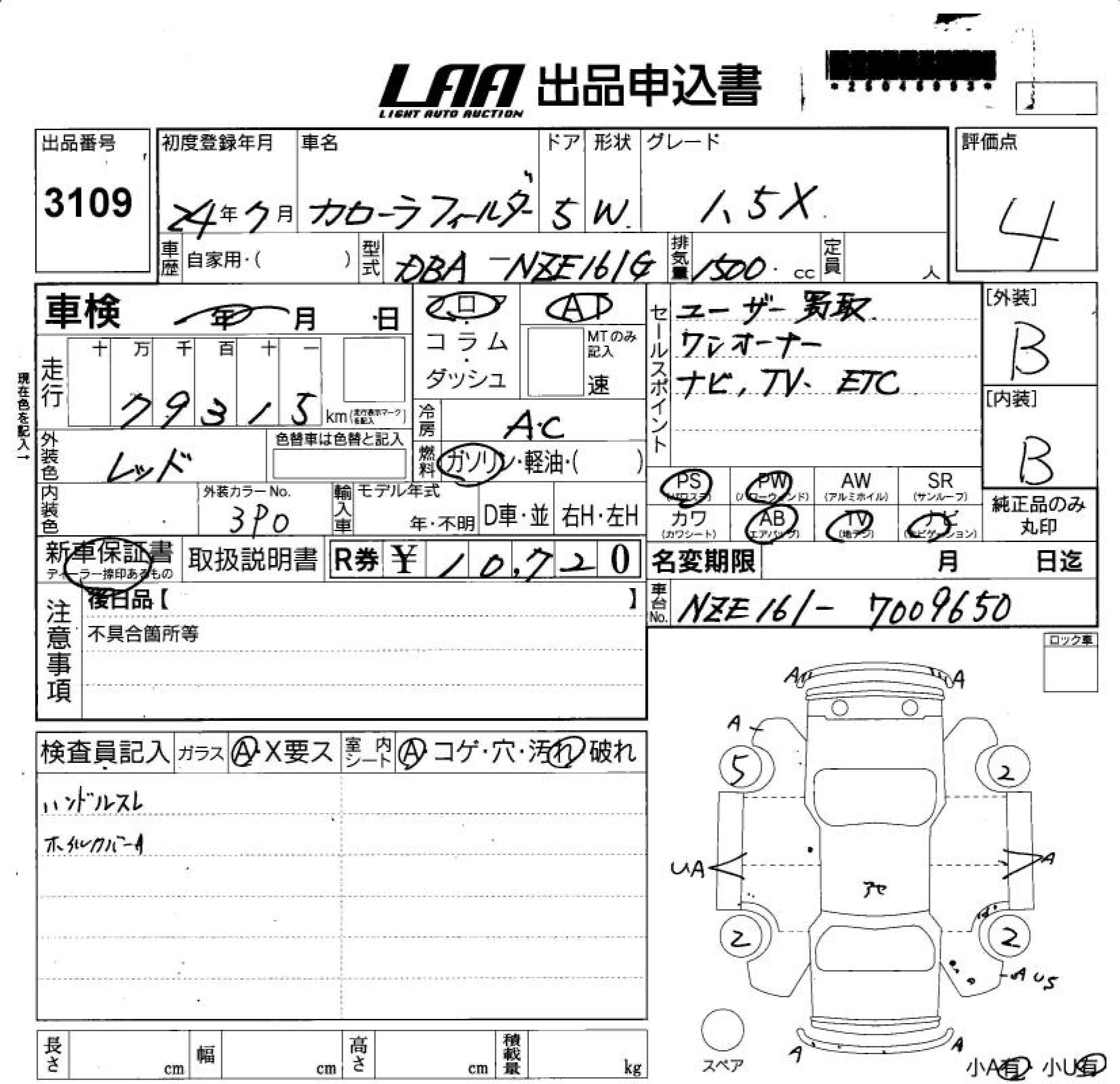 TOYOTA COROLLA FIELDER - лот 3109