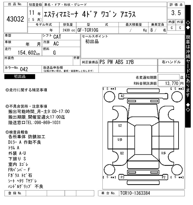TOYOTA ESTIMA EMINA - лот 43032