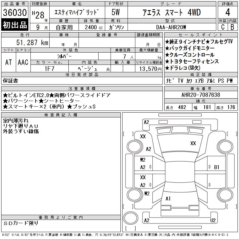 TOYOTA ESTIMA HYBRID AERAS SMART 4WD - лот 36030