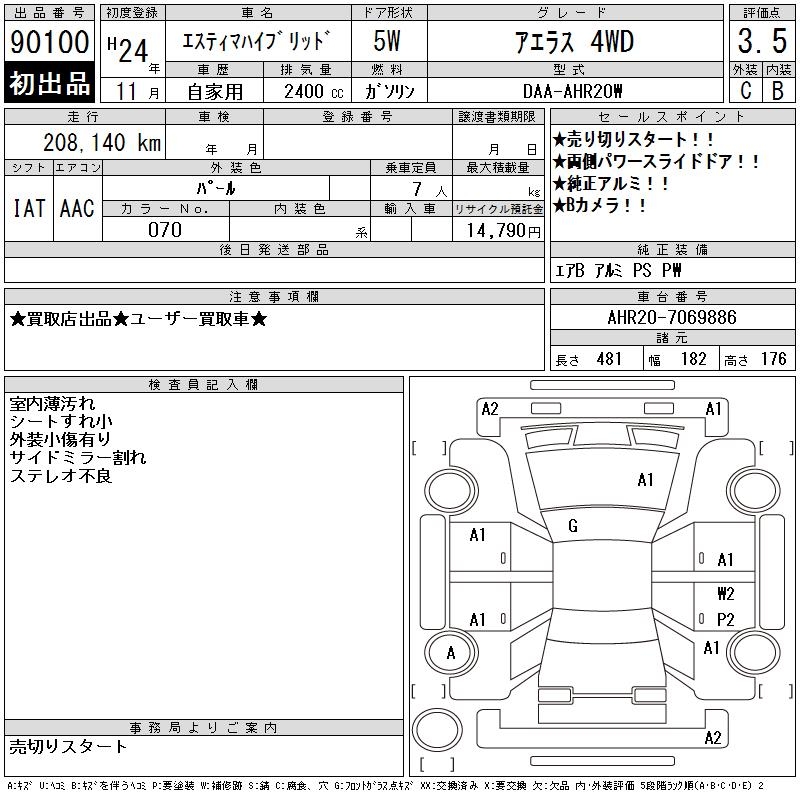 TOYOTA ESTIMA HYBRID AERAS 4WD - лот 90100