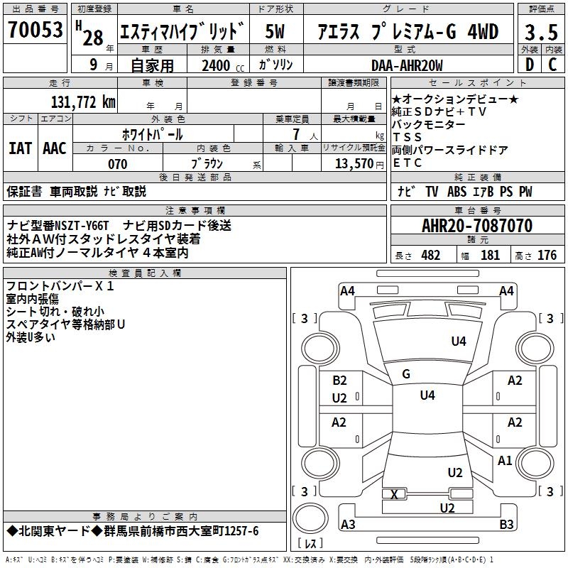 TOYOTA ESTIMA HYBRID AERAS PREMIUM -G 4WD - лот 70053