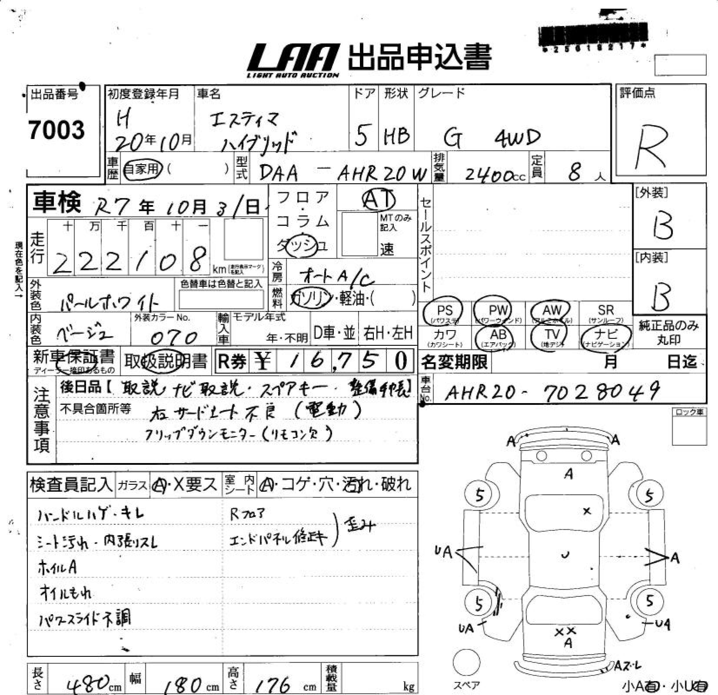 TOYOTA ESTIMA HYBRID G 4WD - лот 7003
