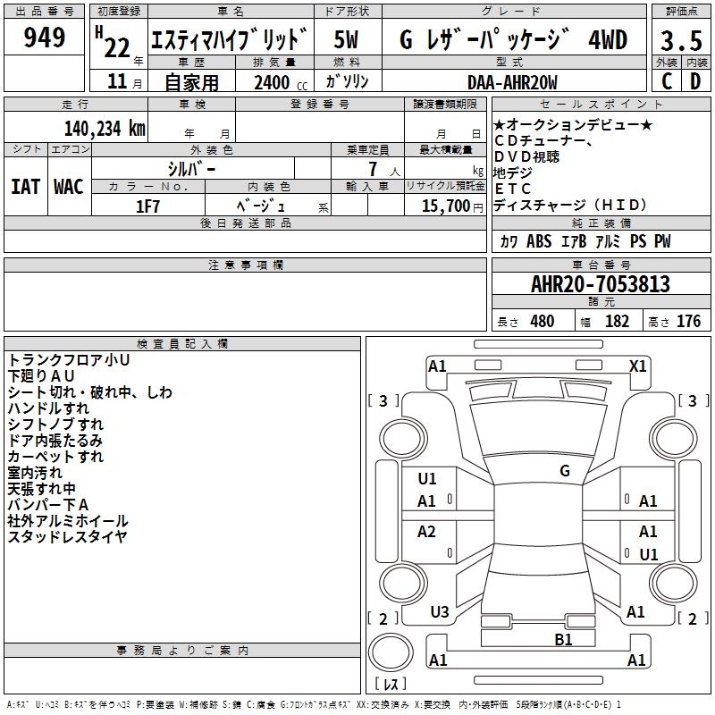 TOYOTA ESTIMA HYBRID G LEATHER PACKAGE 4WD - лот 949