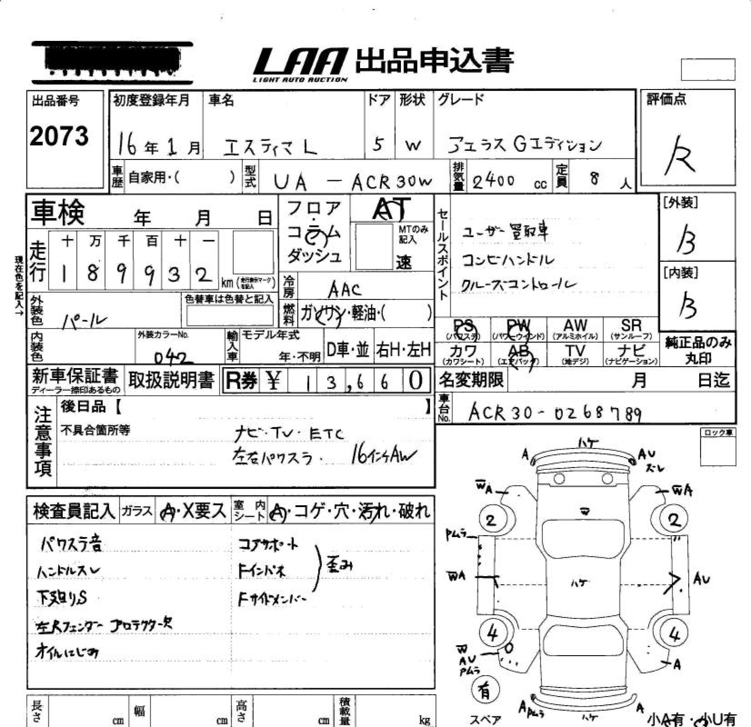 TOYOTA ESTIMA L AERAS G EDITION - лот 2073