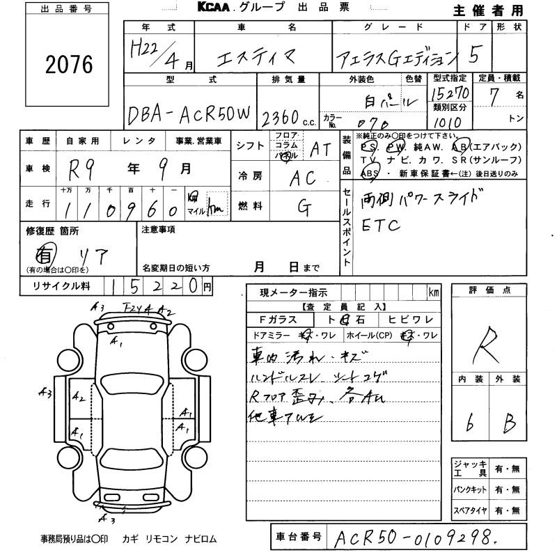 TOYOTA ESTIMA - лот 2076