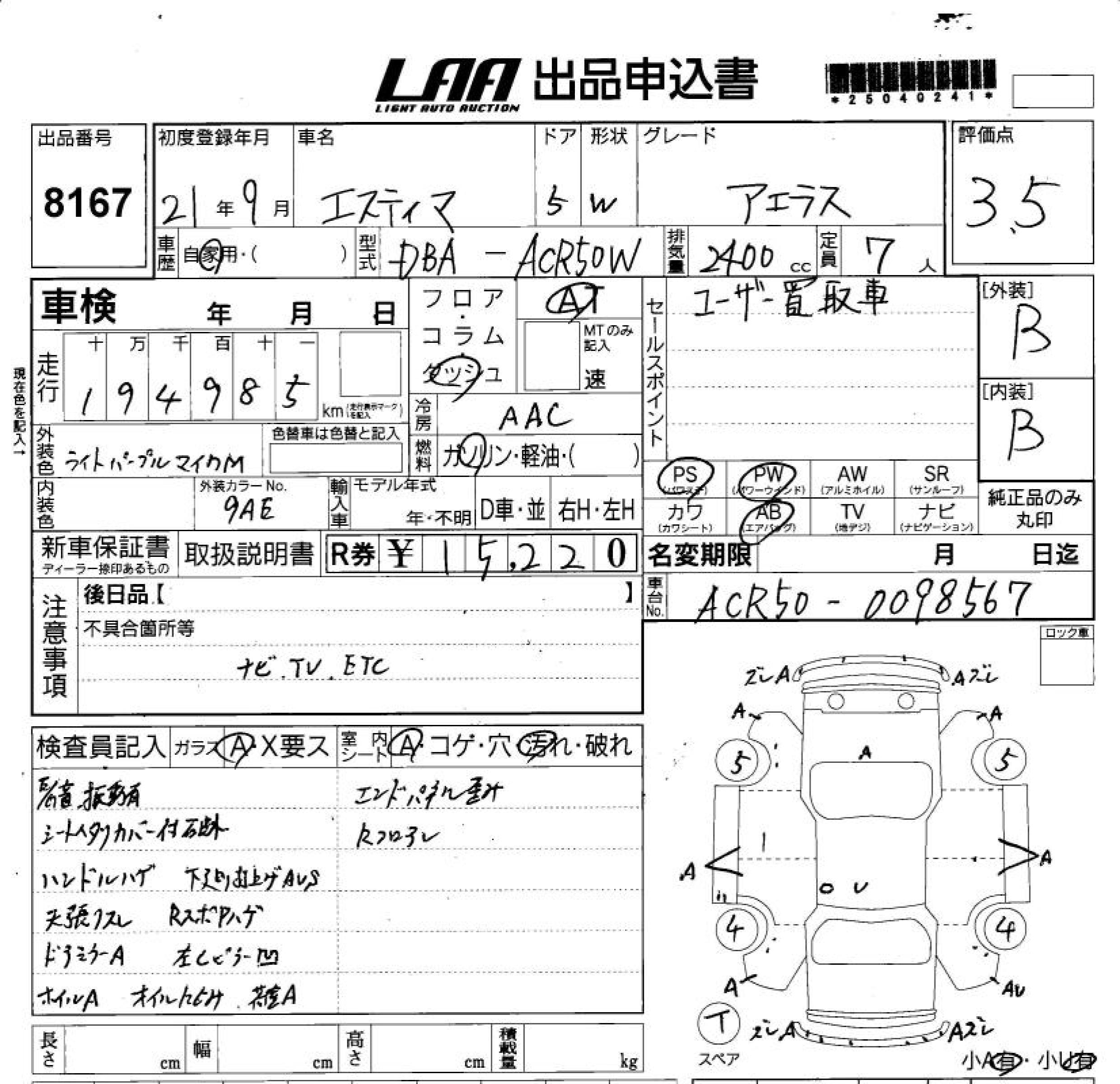 TOYOTA ESTIMA - лот 8167
