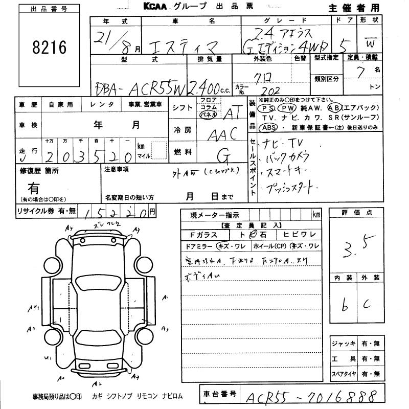 TOYOTA ESTIMA - лот 8216