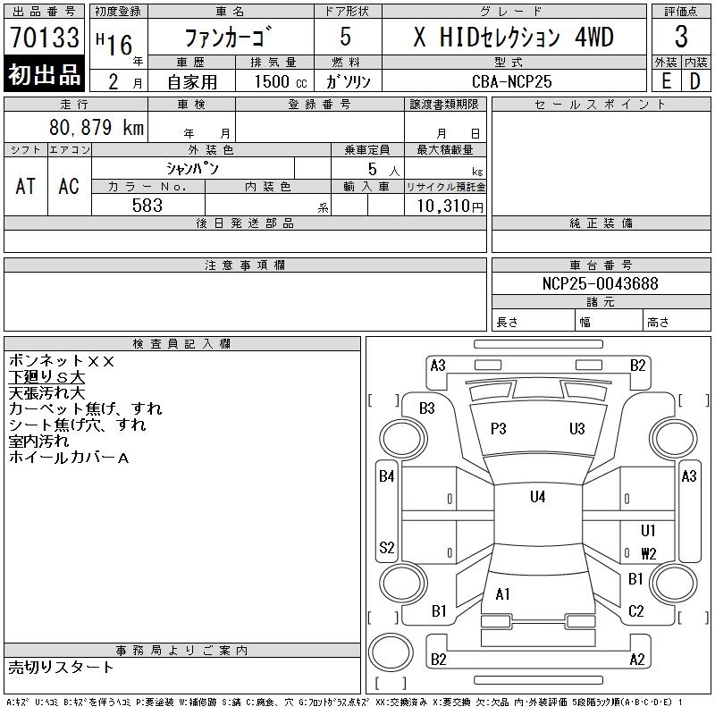 TOYOTA FUN CARGO X HID SELECTION 4WD - лот 70133