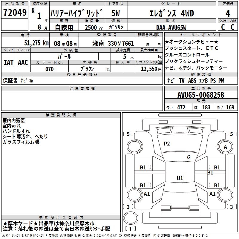 TOYOTA HARRIER HYBRID - лот 72049