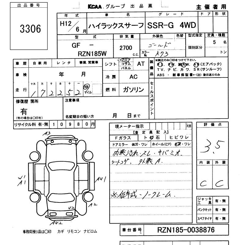 TOYOTA HILUX SURF SSR-G 4WD - лот 3306
