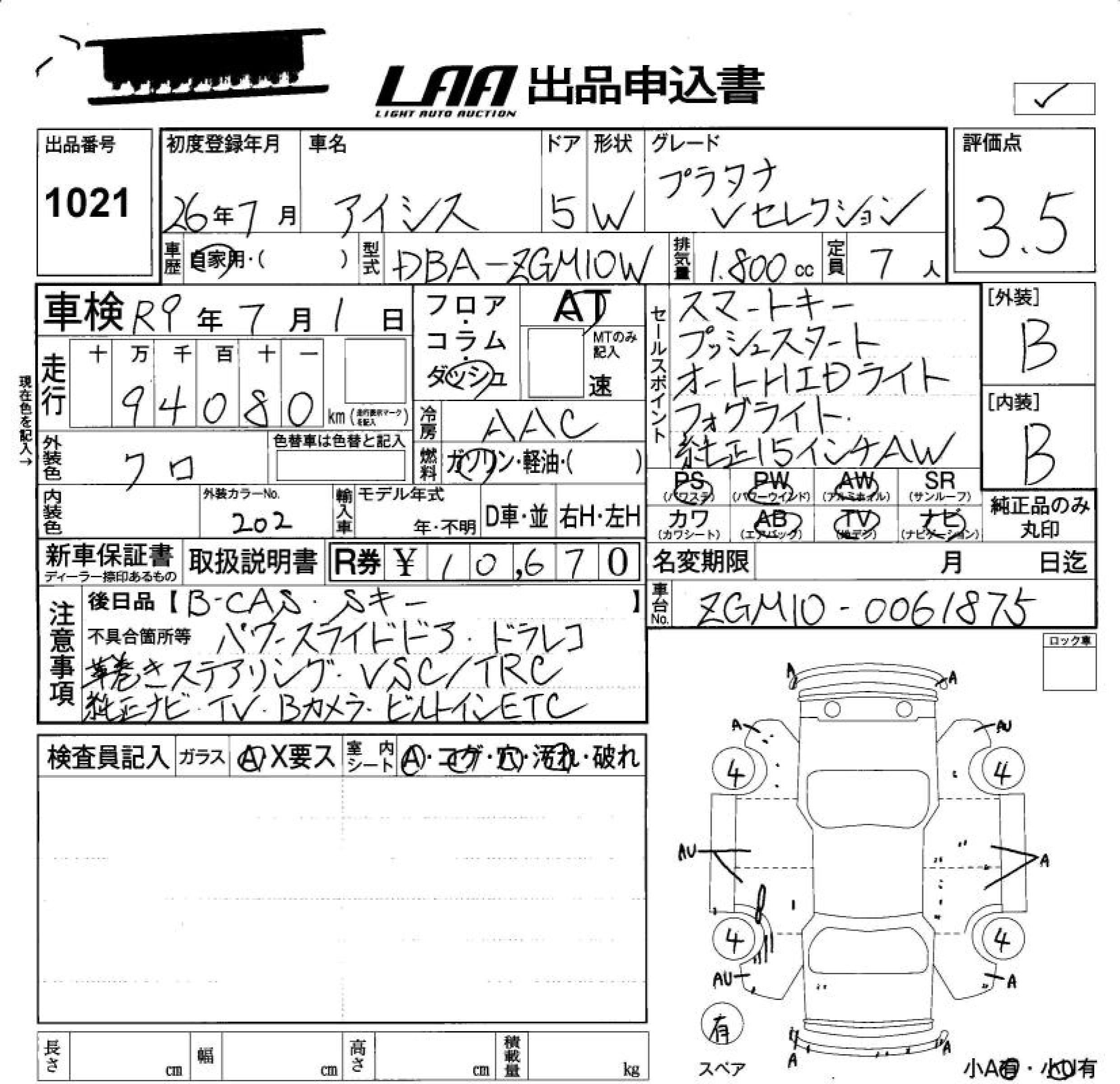 TOYOTA ISIS PLATANA V SELECTION - лот 1021