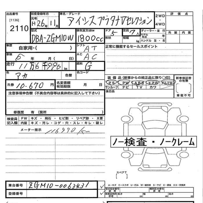 TOYOTA ISIS PLATANA V SELECTION - лот 2110