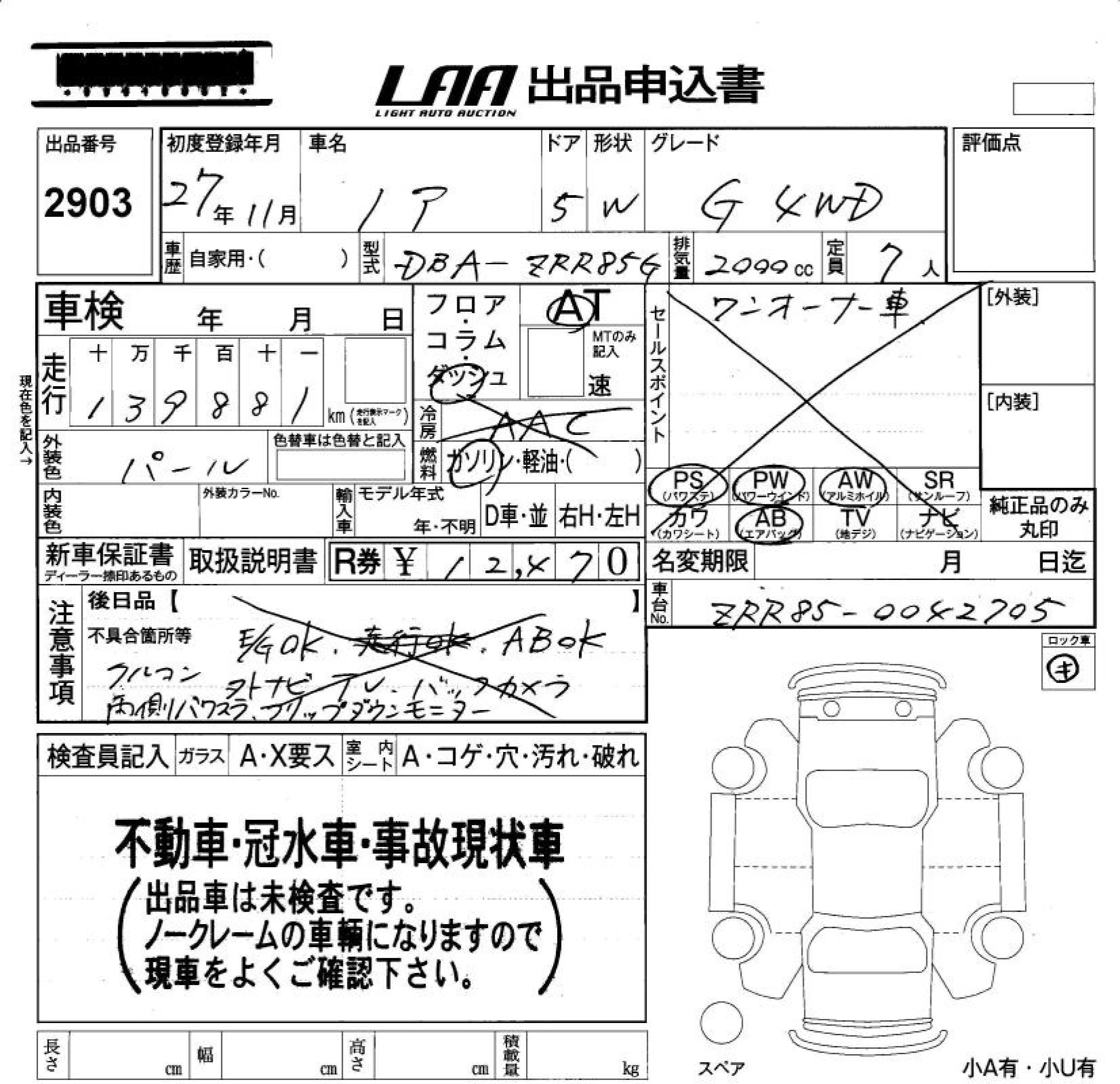 TOYOTA NOAH G 4WD - лот 2903