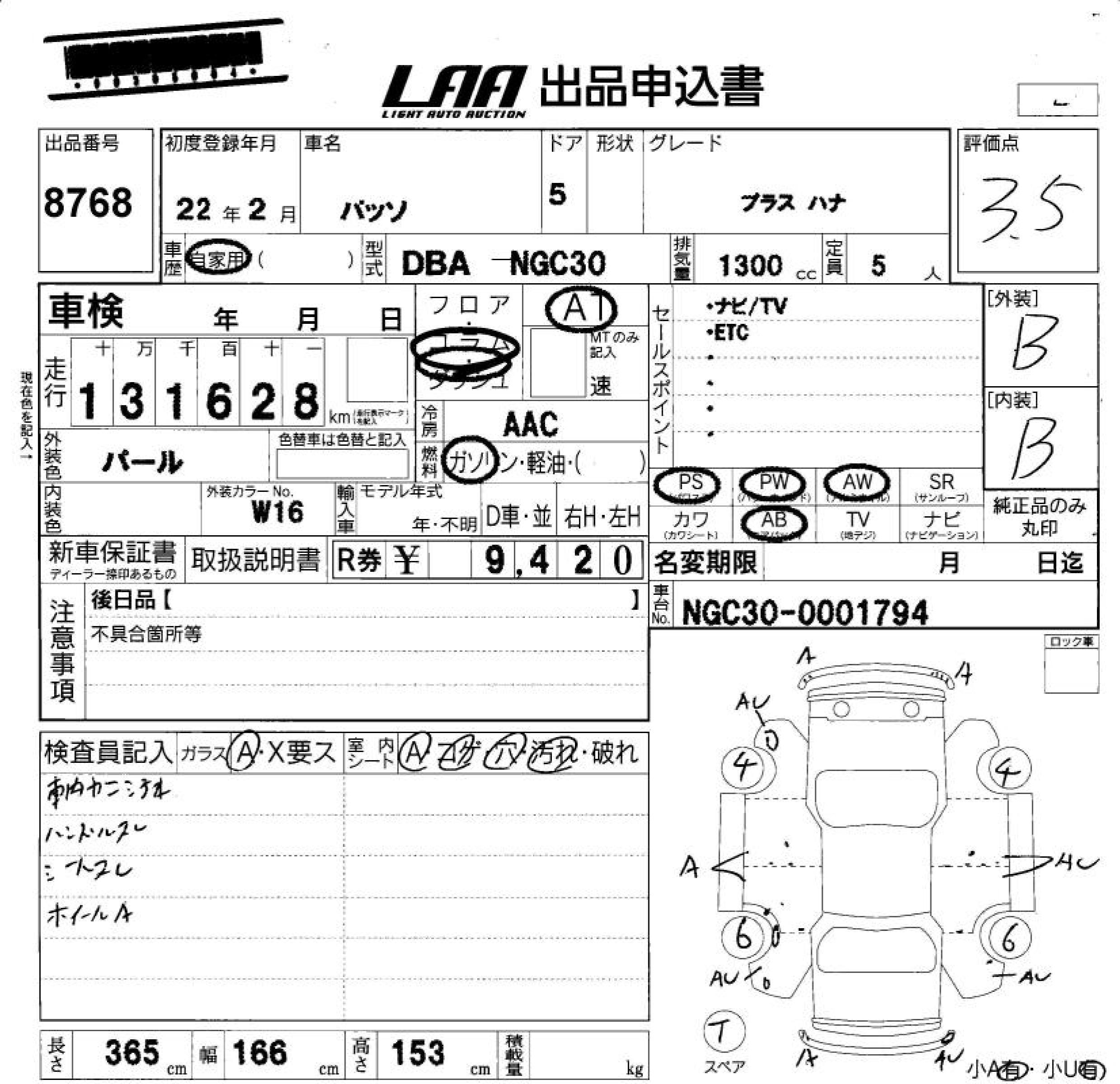 TOYOTA PASSO +HANA - лот 8768