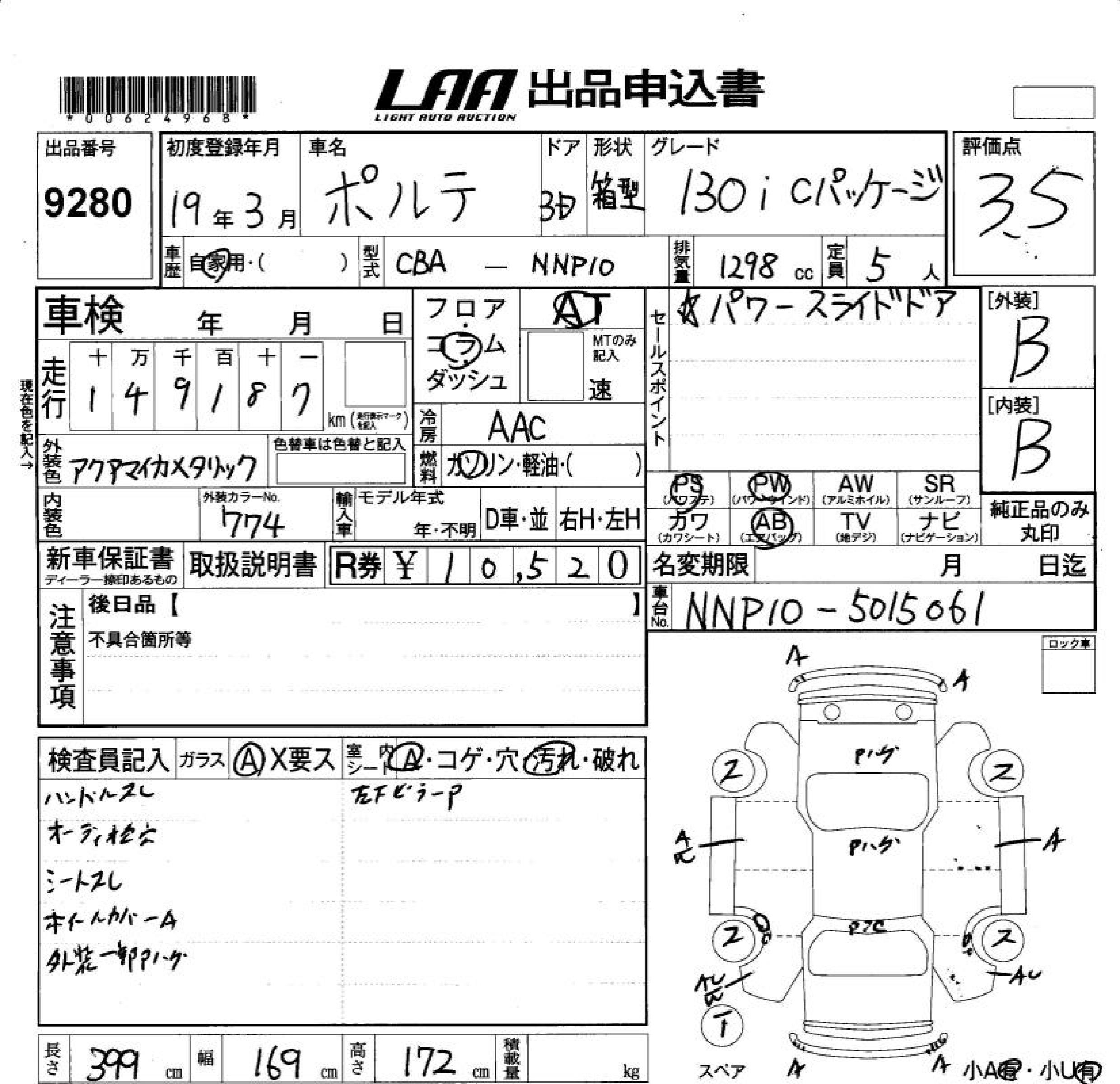 TOYOTA PORTE 130I C PACKAGE - лот 9280