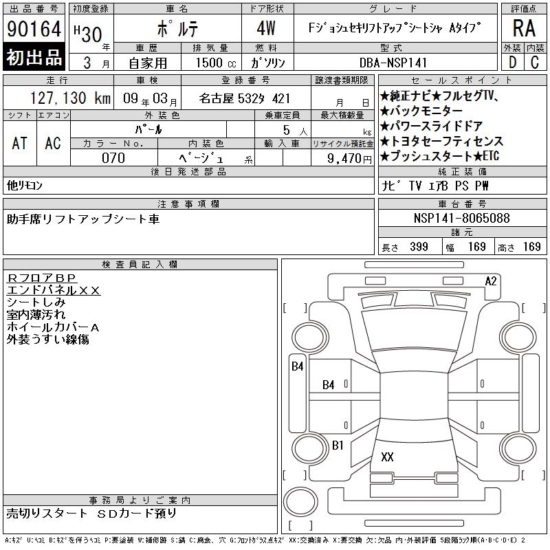 TOYOTA PORTE FJOSHU SEAT LIFT UP SEAT CAR - лот 90164