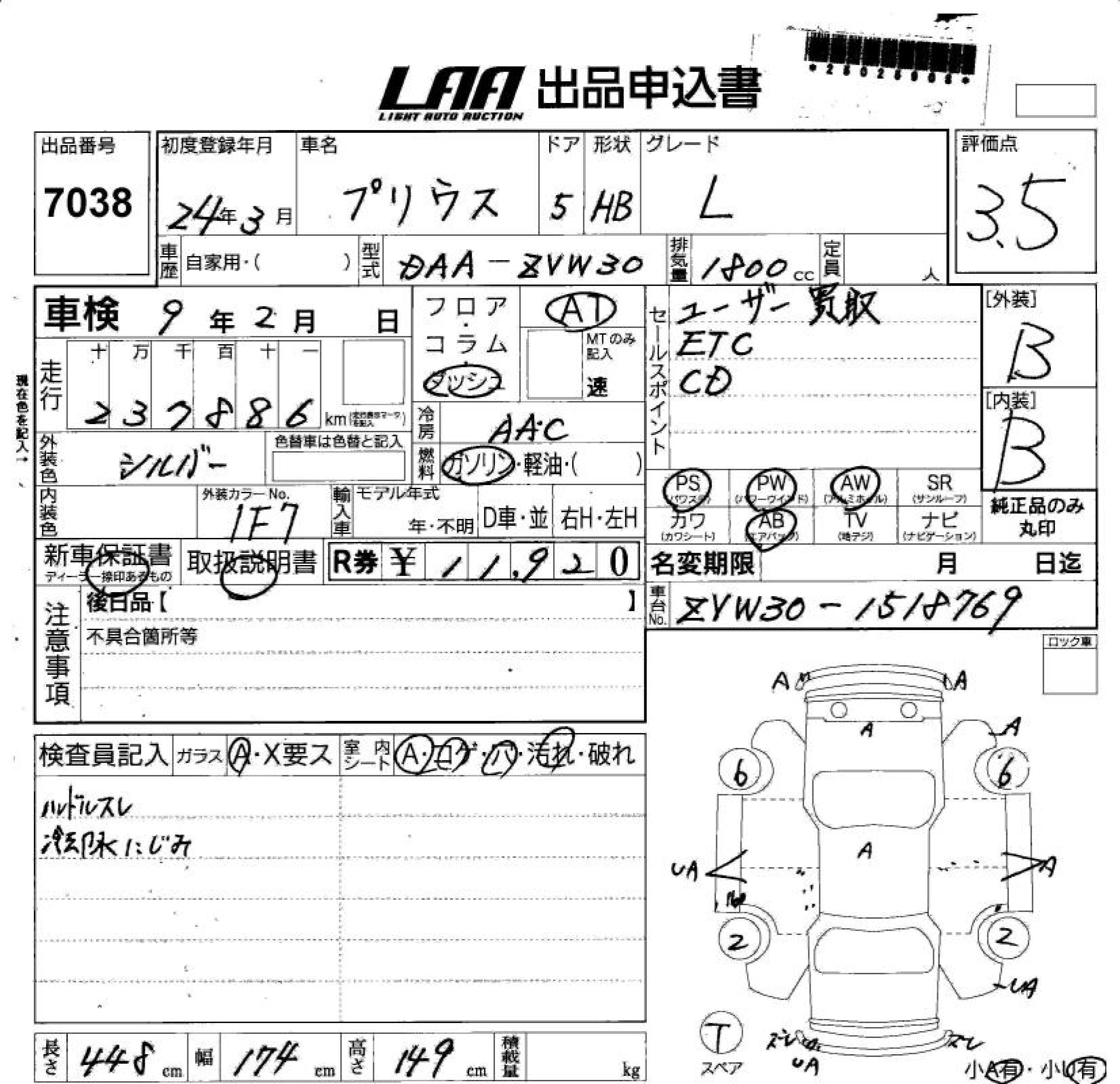 TOYOTA PRIUS L - лот 7038
