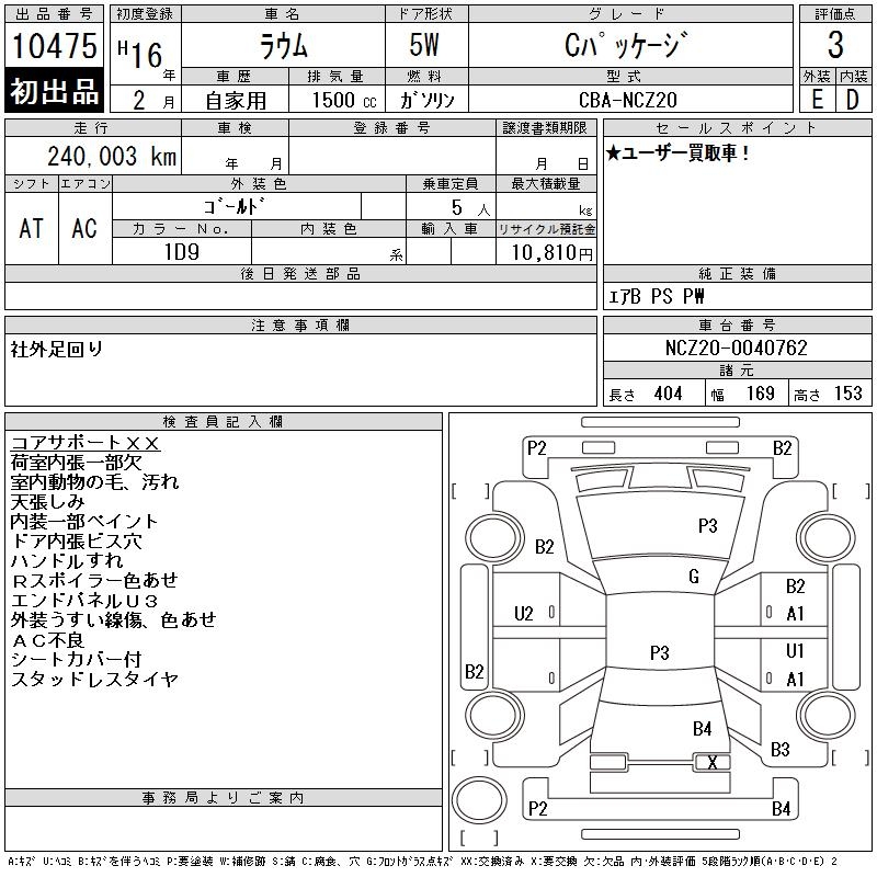 TOYOTA RAUM C PACKAGE - лот 10475