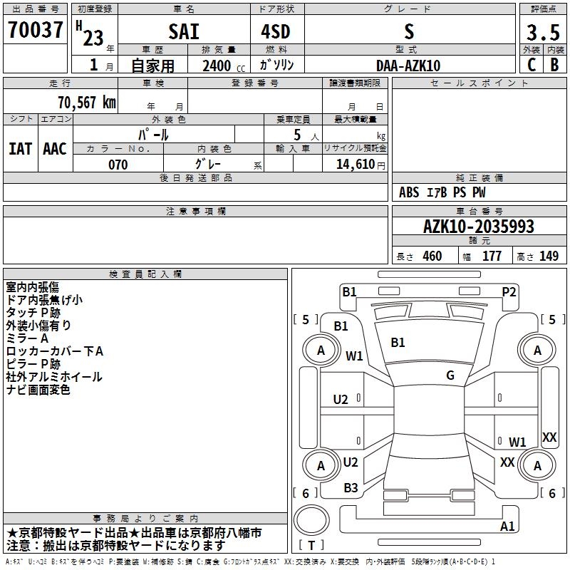 TOYOTA SAI S - лот 70037