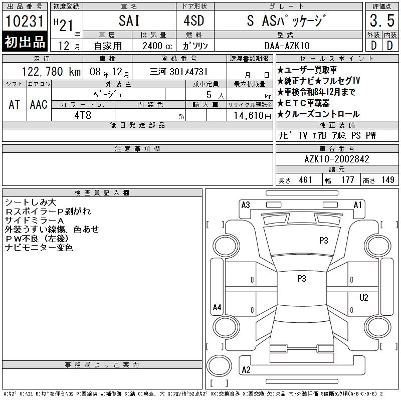 TOYOTA SAI S AS PACKAGE - лот 10231