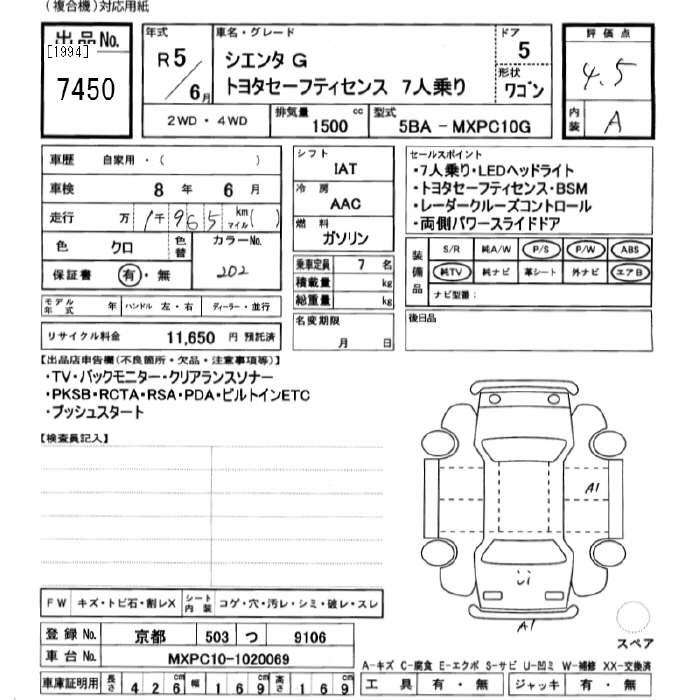 TOYOTA SIENTA G TOYOTA SAFETY SENS7 SEAT - лот 7450