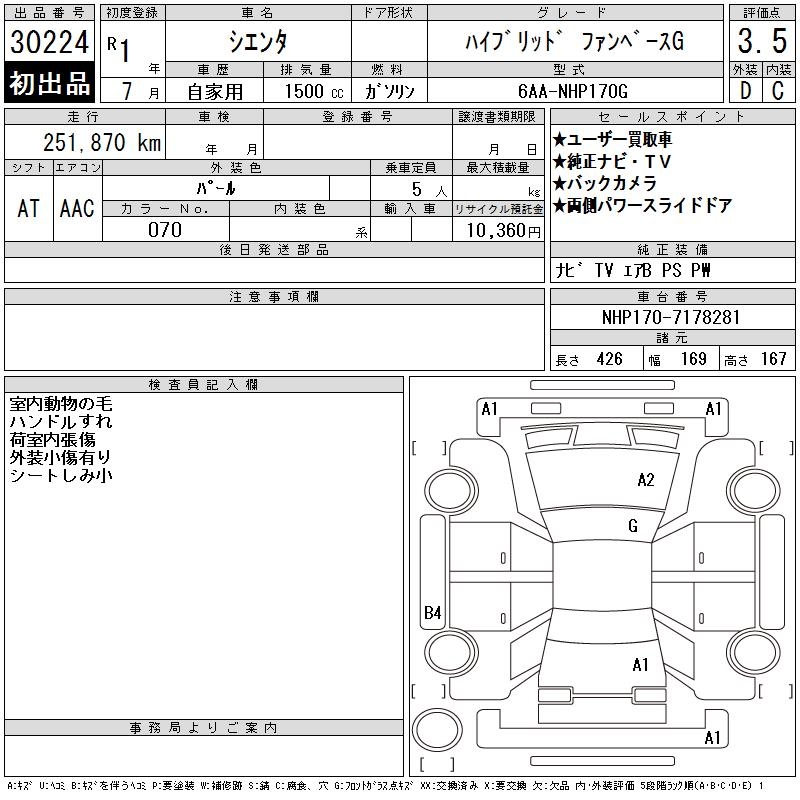 TOYOTA SIENTA HYBRID FAN BASE G - лот 30224