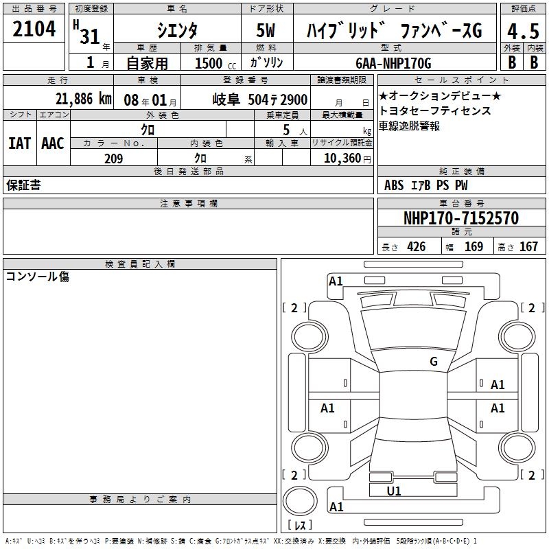 TOYOTA SIENTA HYBRID FAN BASE G - лот 2104