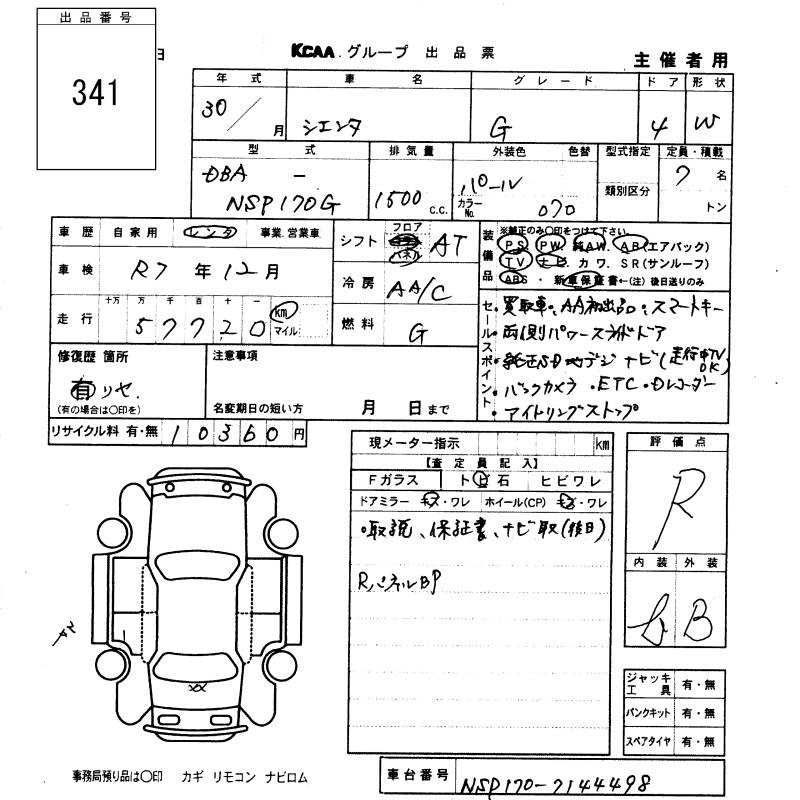 TOYOTA SIENTA G - лот 341