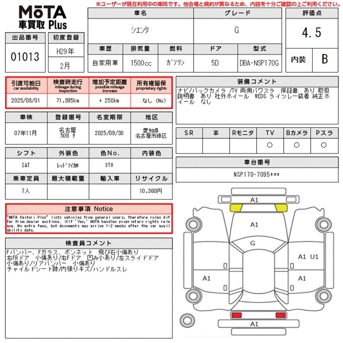 TOYOTA SIENTA G - лот 1013