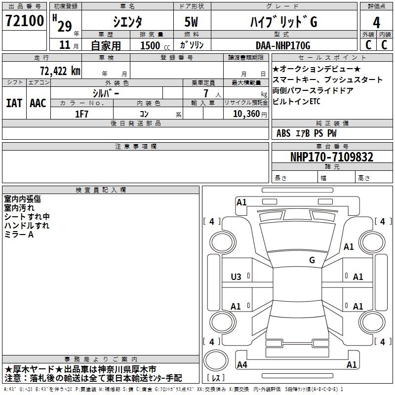 TOYOTA SIENTA HYBRID G - лот 72100