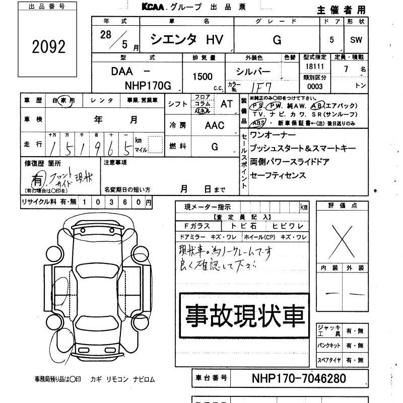 TOYOTA SIENTA HYBRID G - лот 2092