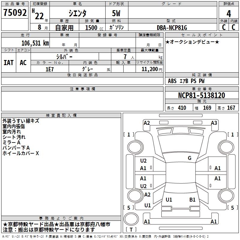 TOYOTA SIENTA - лот 75092