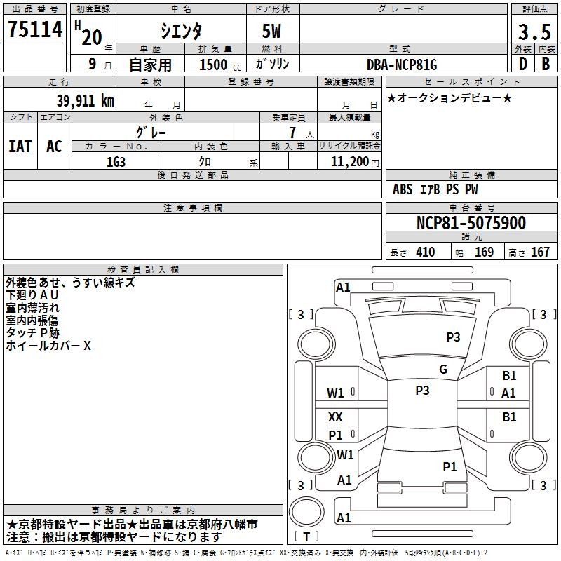 TOYOTA SIENTA - лот 75114