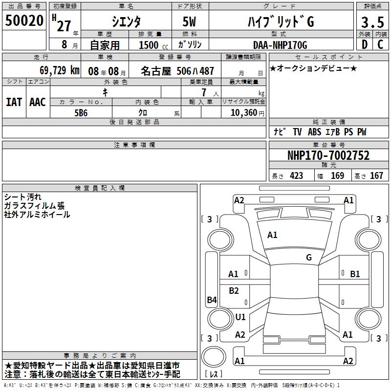 TOYOTA SIENTA HYBRID G - лот 50020