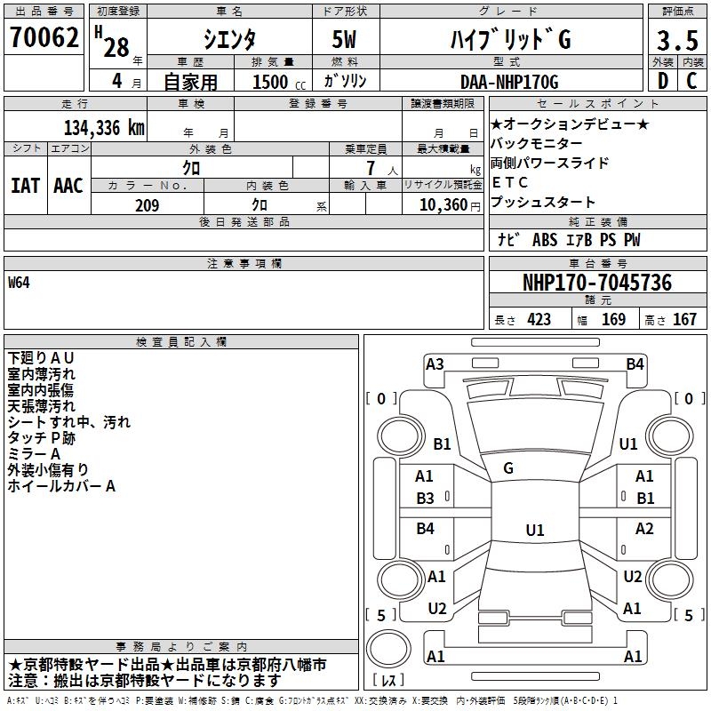 TOYOTA SIENTA HYBRID G - лот 70062