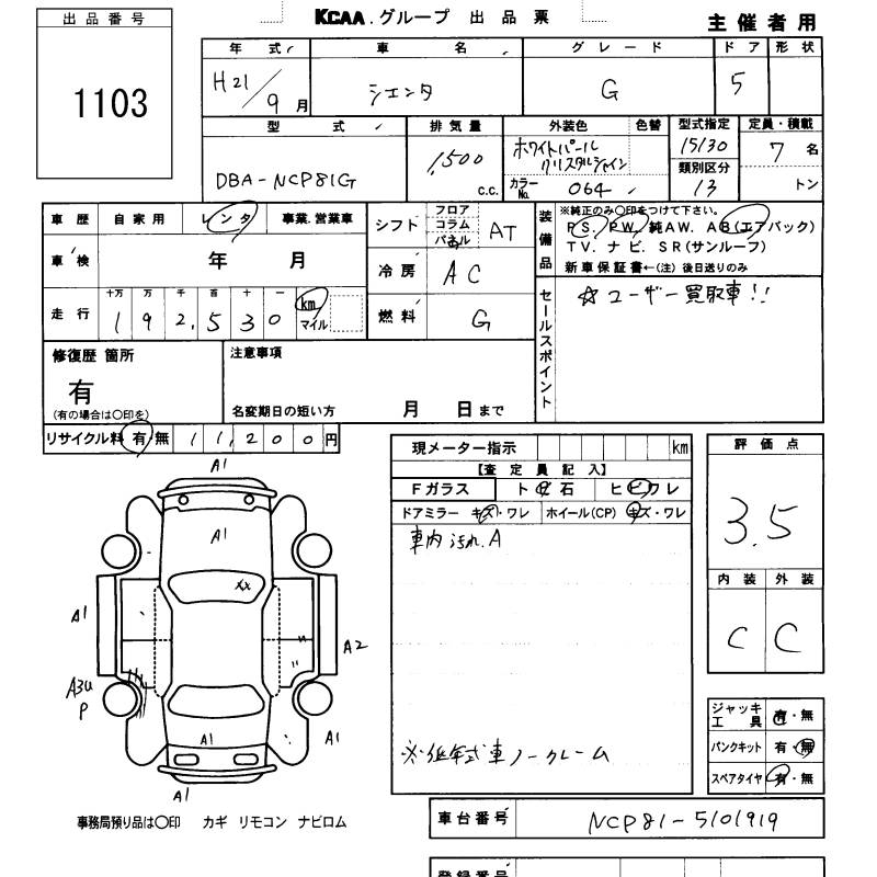 TOYOTA SIENTA - лот 1103
