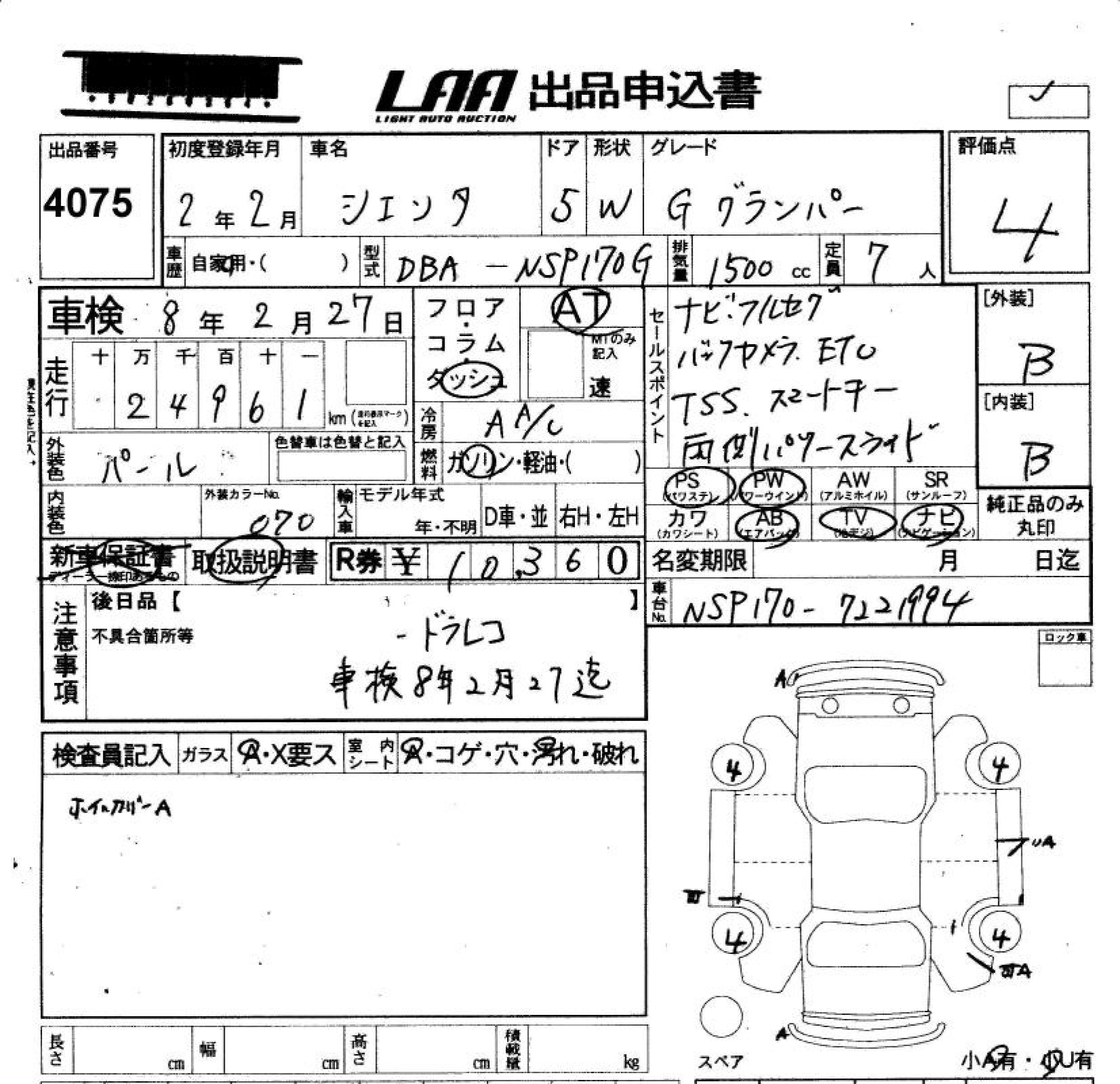 TOYOTA SIENTA G GRAN PA- - лот 4075