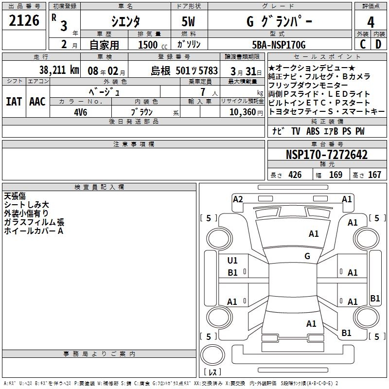 TOYOTA SIENTA G GRAN PA- - лот 2126