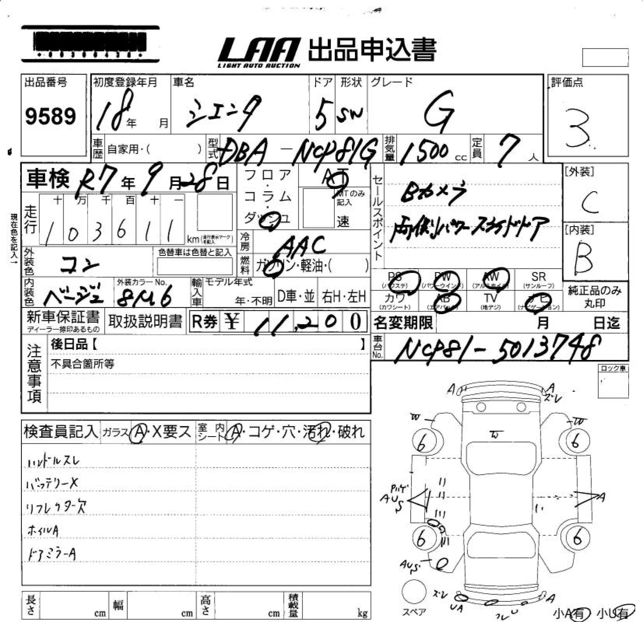 TOYOTA SIENTA G - лот 9589