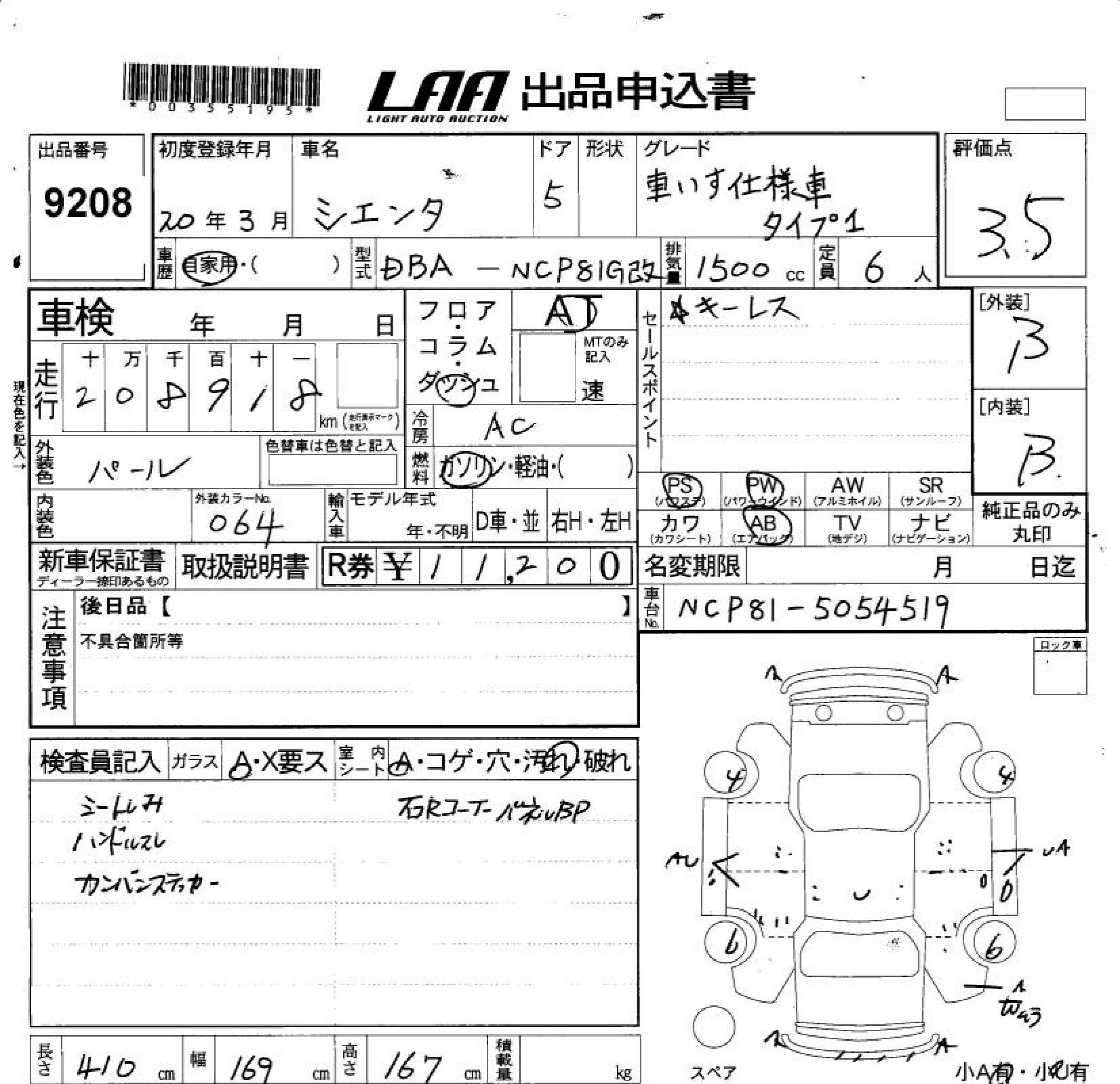 TOYOTA SIENTA WHEELCHAIR SPECIFICATION CAR TYPE 1 - лот 9208