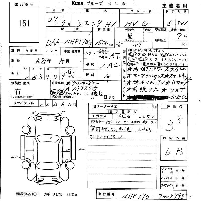 TOYOTA SIENTA HYBRID G - лот 151