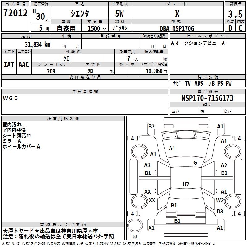 TOYOTA SIENTA X - лот 72012
