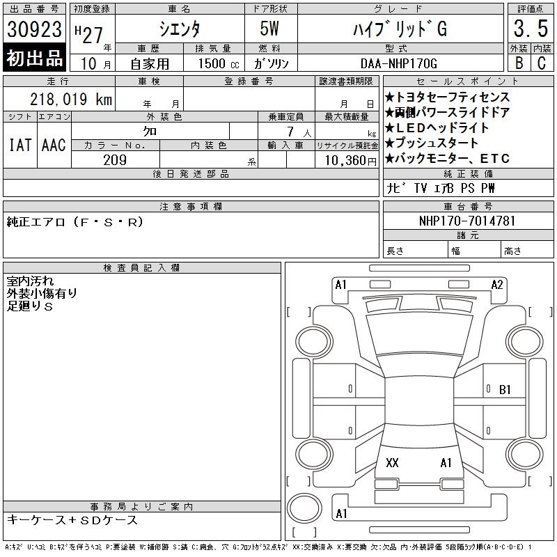 TOYOTA SIENTA HYBRID G - лот 30923